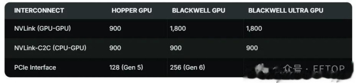 Blackwell 系列的互联技术包括 NVLINK 交换机、NVLINK-C2C 连接,以及用于主机 GPU 连接的 PCIe Gen6 x16 接口。以下是 NVLINK 5 及主机端连接的关键特性: