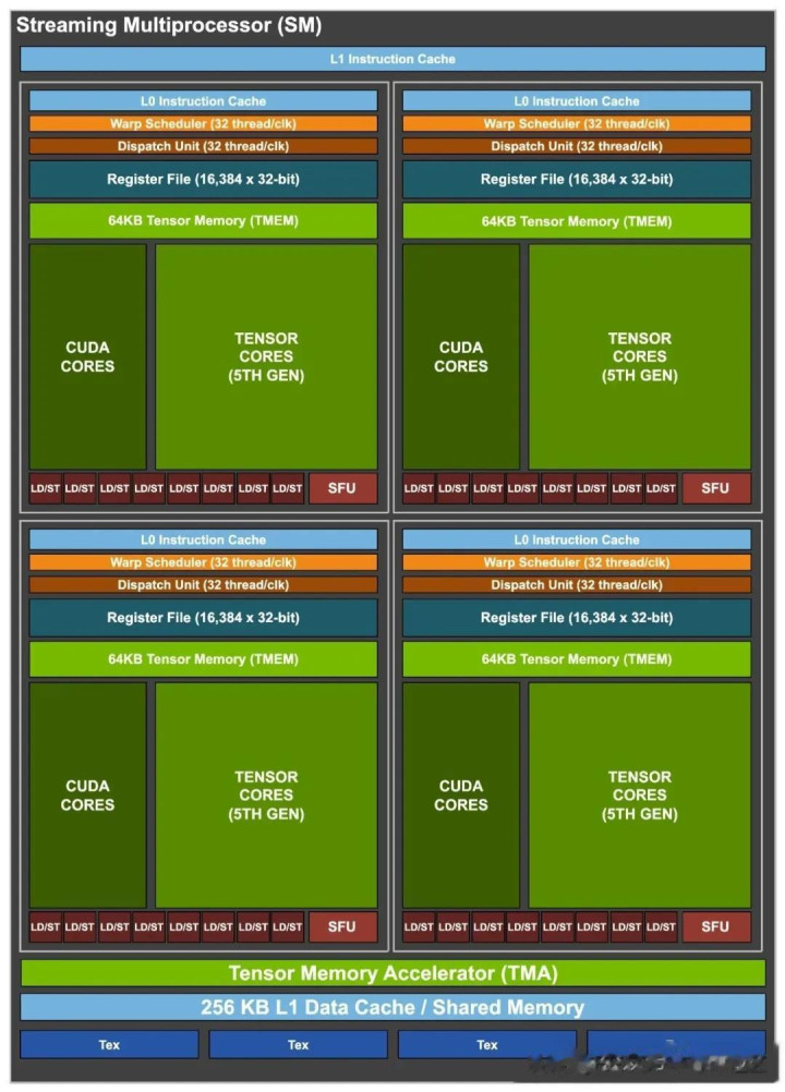 英伟达 Blackwell Ultra GB300 GPU 集成了 160 个流式多处理器(SM),每个 SM 包含 128 个 CUDA 核心、4 个支持 FP8/FP6/NVFP4 精度计算的第五代张量核心、256KB 张量内存(TMEM)及特殊函数单元(SFU)。整体规格达到 20480 个 CUDA 核心、640 个张量核心及 40MB TMEM。