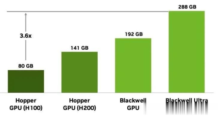 Blackwell Ultra 还实现了内存规格的重大升级:搭载 288GB HBM3e 显存,较前代 Blackwell GB200 的最高 192GB 提升显著。这一升级使其能够支持万亿级参数规模的 AI 模型。内存采用 8 堆叠设计,配备 16 个 512 位控制器(总带宽 8192 位),单 GPU 显存带宽达 8TB/s,具体优势包括: