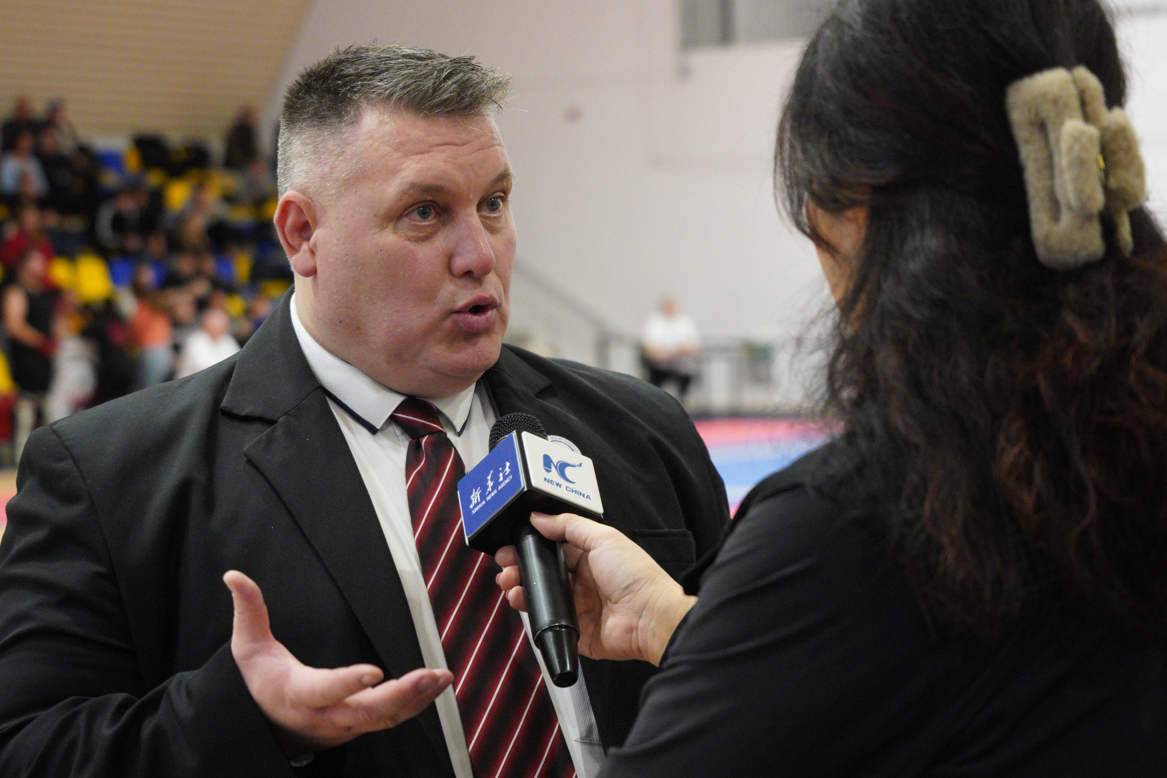 2月5日,欧洲武联主席帕特里克·范·坎彭豪特在布达佩斯的竞技武术套路训练营接受采访。新华社发(弗尔季·奥蒂洛摄)“我们不仅仅要扩大成员数量,最重要的是让(欧洲)每一个国家(地区)都拥有平等发展武术的机会,培养运动员、教练员和裁判员,在同一体系和规则下同步前进……各大洲的武术人需要形成合力,在奥林匹克大舞台上齐心协力。”