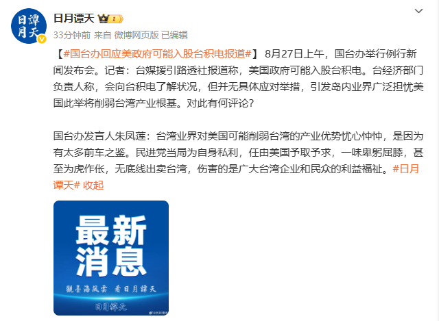 8月27日,据日月谭天消息,国台办举行例行新闻发布会。记者提问,台媒援引路透社报道称,美国政府可能入股台积电。台经济部门负责人称,会向台积电了解状况,但并无具体应对举措,引发岛内业界广泛担忧美国此举将削弱台湾产业根基。对此有何评论?