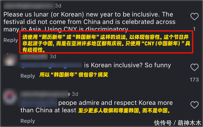 可能会有网友说,韩国也过“春节”。但韩国有自己的“seollal”,干嘛非要说成Korean lunar new year?还想偷中国农历吗?