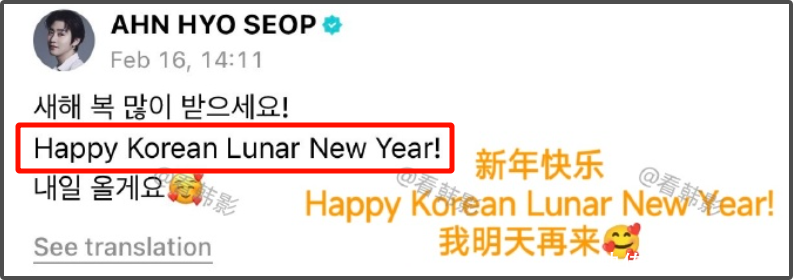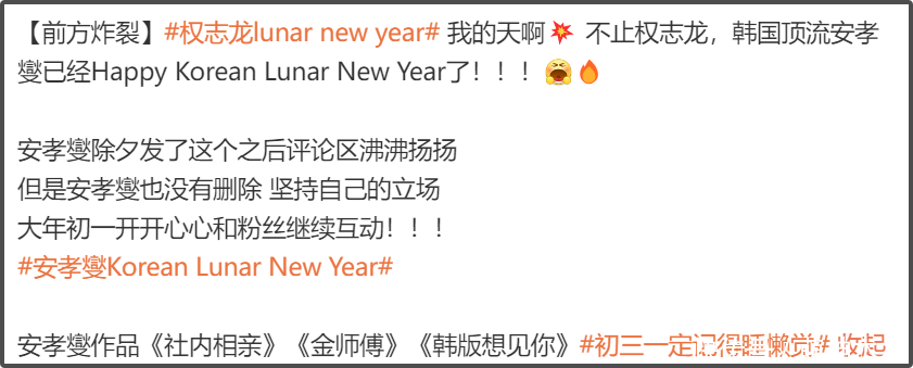 尽管如此,仍然有韩星在暗戳戳搞事,这边权志龙敢在国际音乐节强调“lunar new year”,另一边韩国顶流男星安孝燮就开始“happy Korean lunar new year”,一下子偷了春节和中国农历,两个传统文化,引起评论区争议。