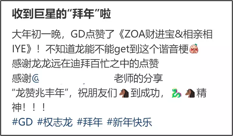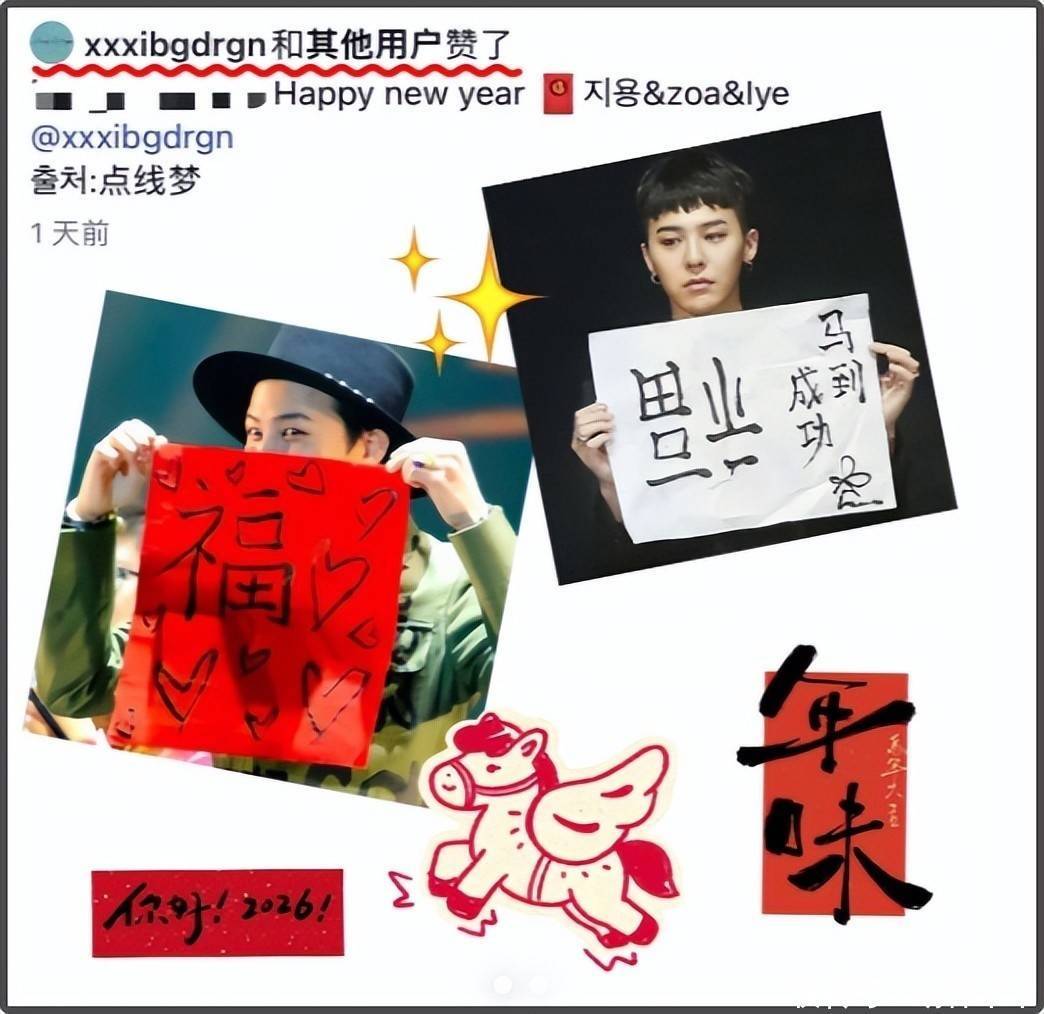 权志龙闯中多年,中粉给他的支持非常多,他自己还会说一点中文,会不知道中国春节?甚至他还为了讨好粉丝点赞过“Chinese new year”。