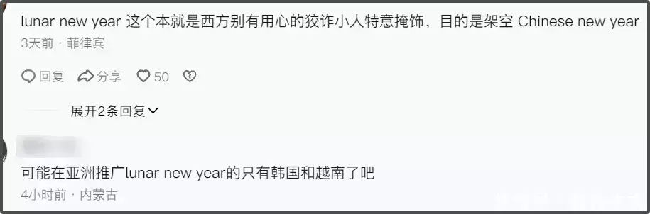 还有韩国人在伦敦中国唐人街的庆祝中国新年动态里,要求把Chinese new year 改成“lunar”或者“Korean”,还认为春节并非起源于中国。
