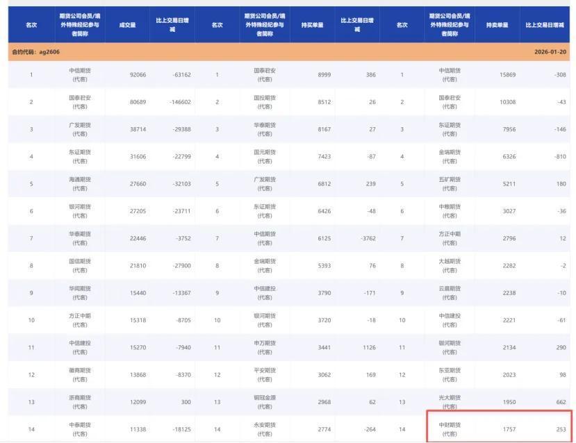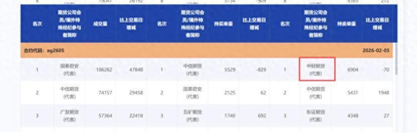 根据沪银期货此前的数据来看,在1月20日,中财期货(代客)仅出现AG2606合约的持仓排名表中,彼时持有空单1757手。