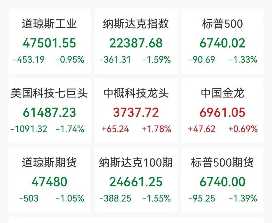 中概股多数逆势走强,成为市场中少有的亮点。纳斯达克金龙中国指数初步收涨0.7%,尽管全周累计仍下跌约4.2%,但单日的逆势表现依然亮眼。热门中概股中,京东涨6.1%,小鹏、携程、网易、金山云涨幅最高达5.9%,小米涨3%,美团、腾讯涨超2%,阿里巴巴涨0.4%;也有部分个股走弱,阿特斯太阳能跌3.7%,小马智行跌8.5%。