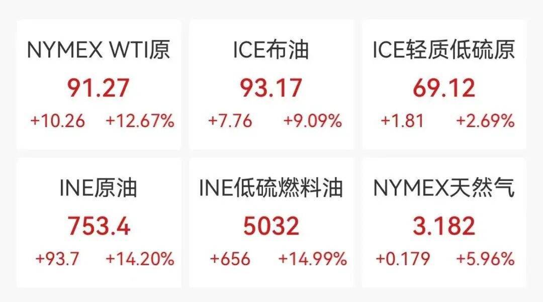 能源市场方面,中东冲突升级引发供应担忧,油价创下历史性周涨幅。WTI原油期货周涨35.6%,报每桶91.27美元;布伦特原油期货周涨27.88%,报每桶93.17美元。两者分别创下自1983年和1991年有记录以来的最大周涨幅。卡塔尔能源部长Saad al-Kaabi表示,所有海湾能源出口国都可能被迫停止生产,这将进一步推高油价。
